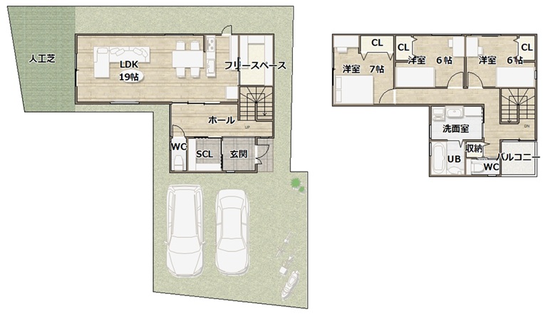 全居室にクローゼットもしくは押入があり、土間リビング、LDK、2階廊下にも収納スペースを配置しているのでお片付けには困りません。